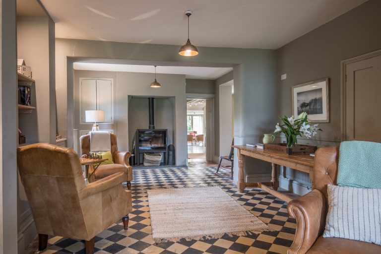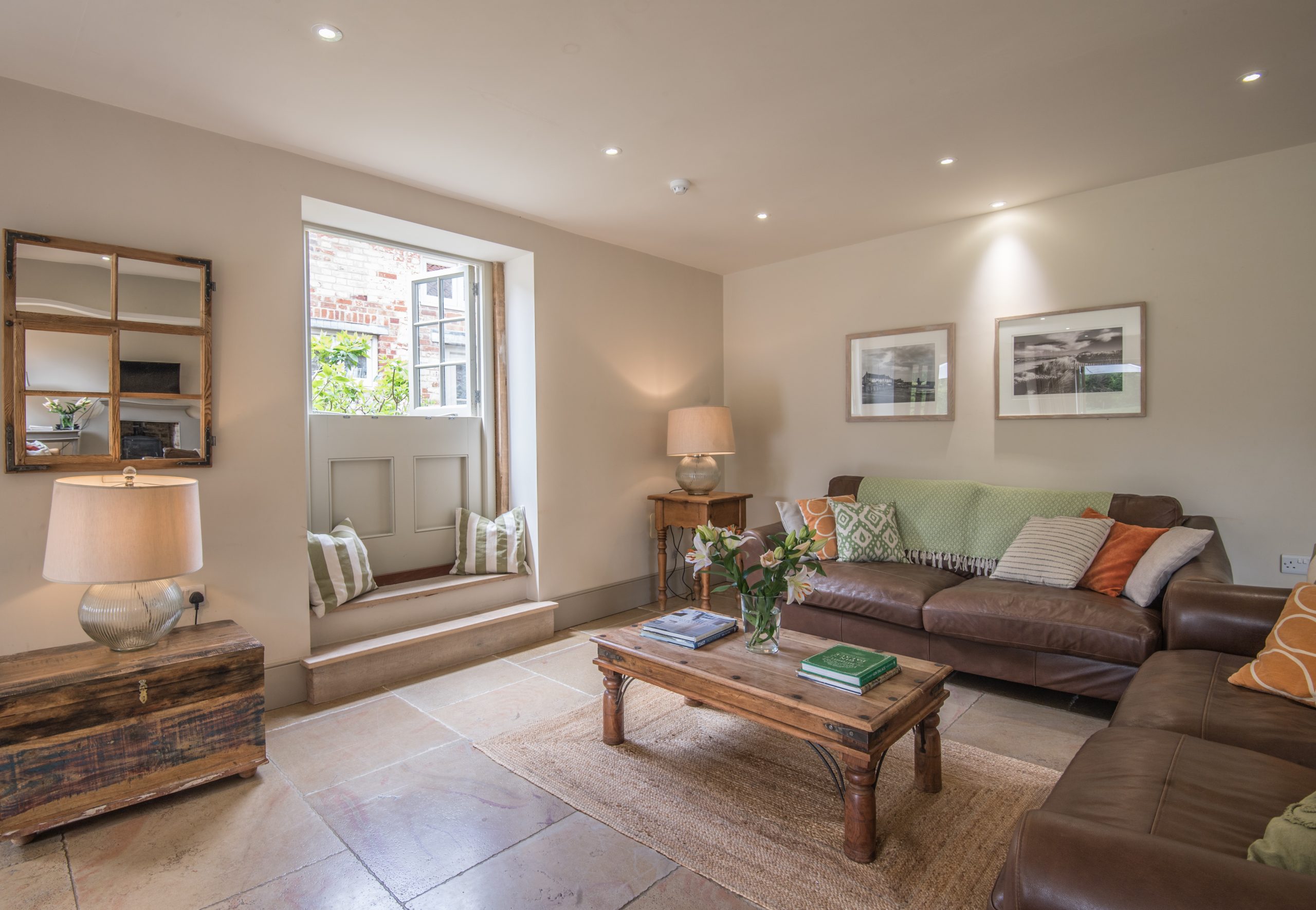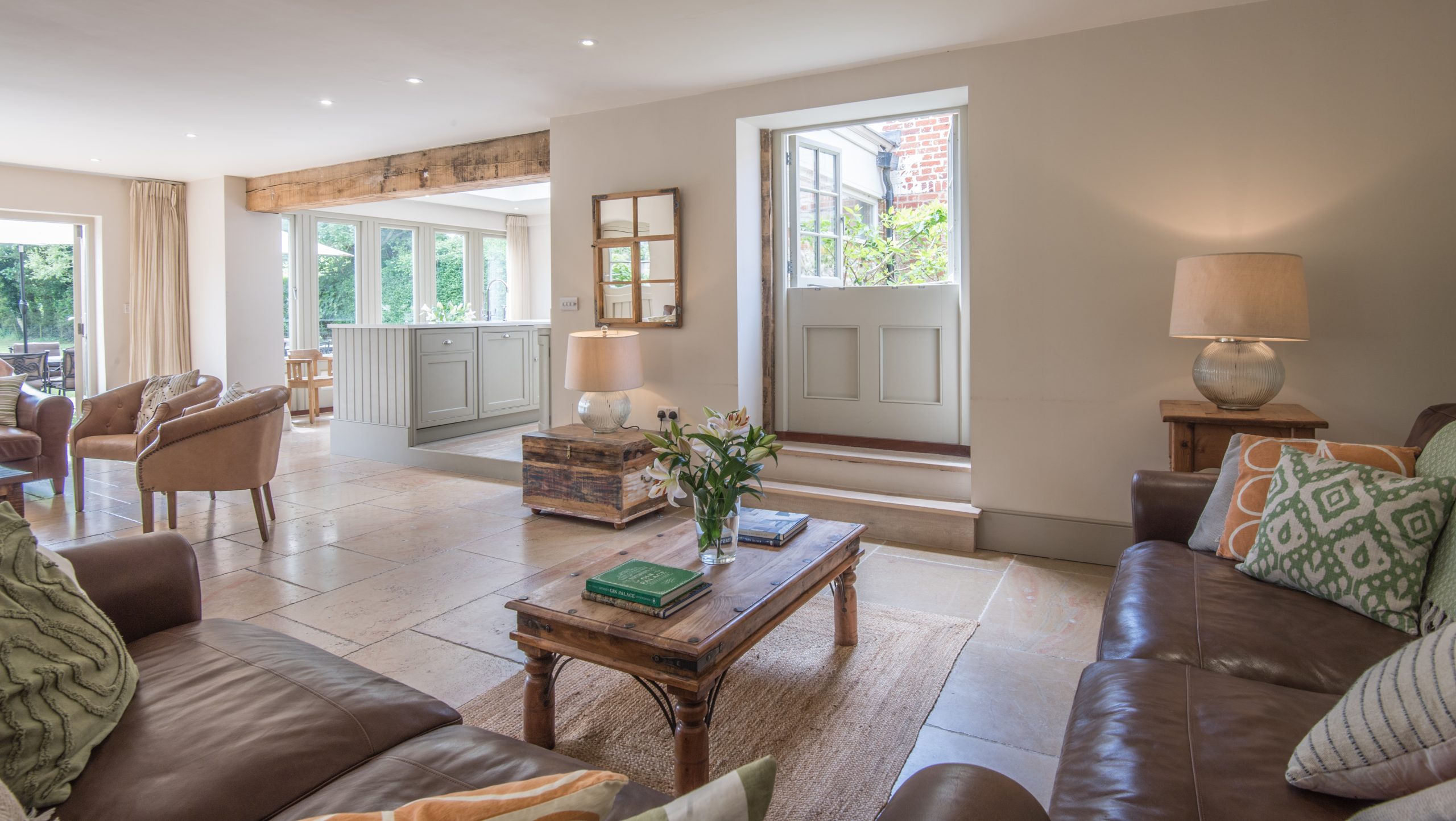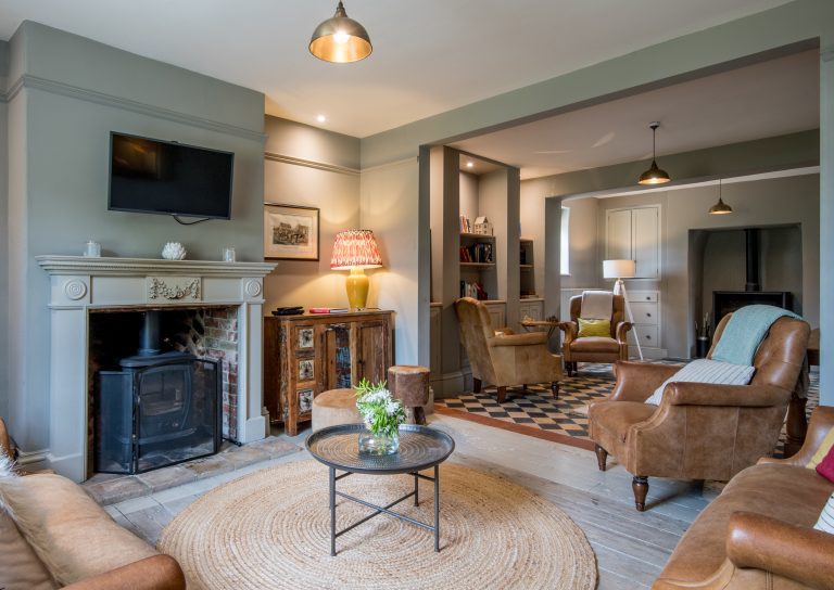 • Large open plan sitting area with an open fire at one end and a large wood burning stove at the other
